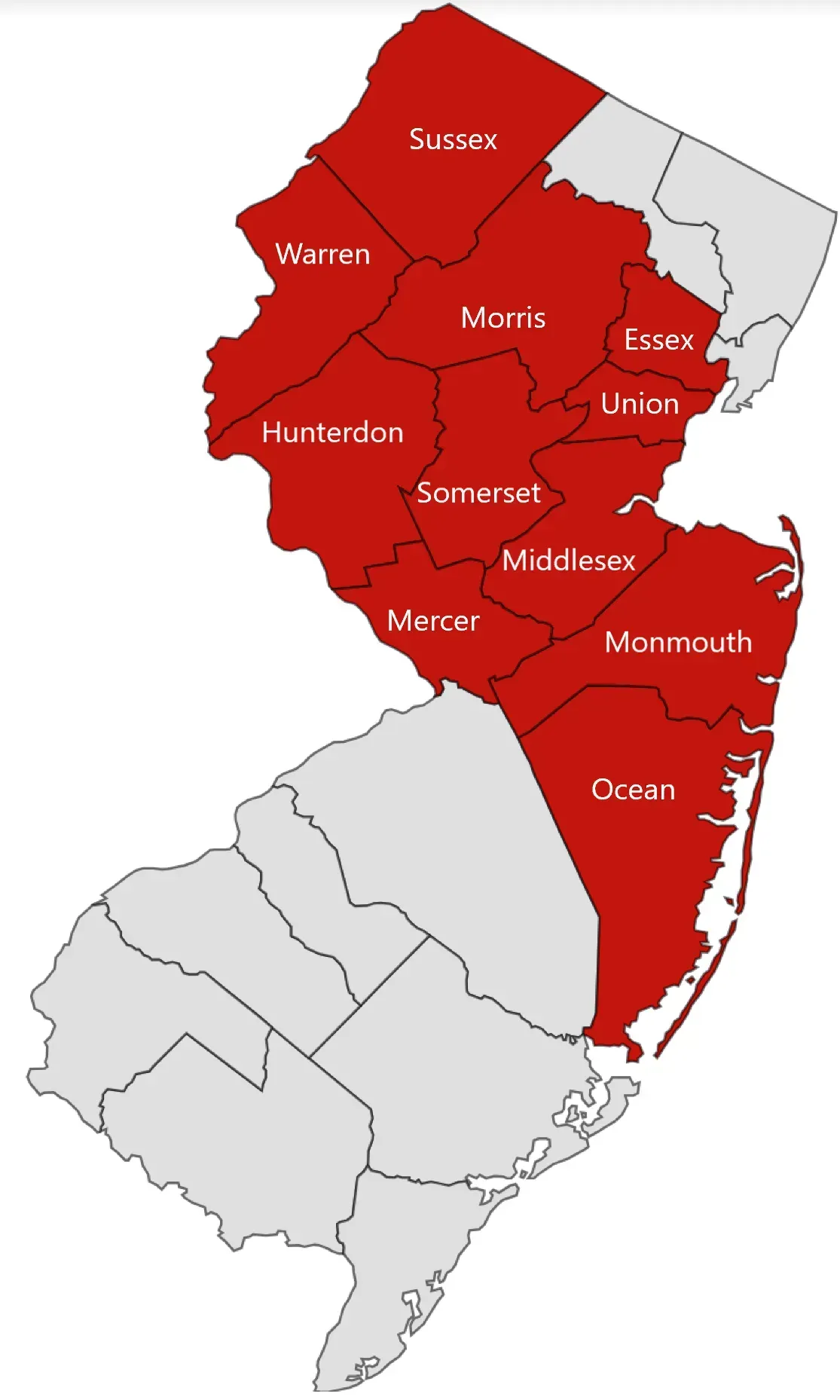 Sussex, Warren, Morris, Essex, Union, Hunterdon, Somerset, Middlesex, Mercer, Monmouth, Ocean