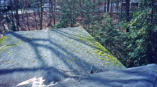 As you can see by the photos, this homeowner has multiple skylights which were leaking. Also, the home had severe algae and moss problems and in some areas, this moss was an inch thick. My crew tore off the entire roof down to the existing plywood sheathing and installed ice and water shield on top of the newly repaired plywood on the entire house. We then installed all new Velux skylights and an algae resistant Tamko dimensional roof to prevent the return of algae.